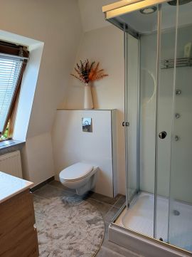 • Emelet (tetőtér, 60 m²): Három hálószoba (14 nm, 12 nm, 8 nm), két fürdőszoba WC-vel, gardrób és közlekedő.